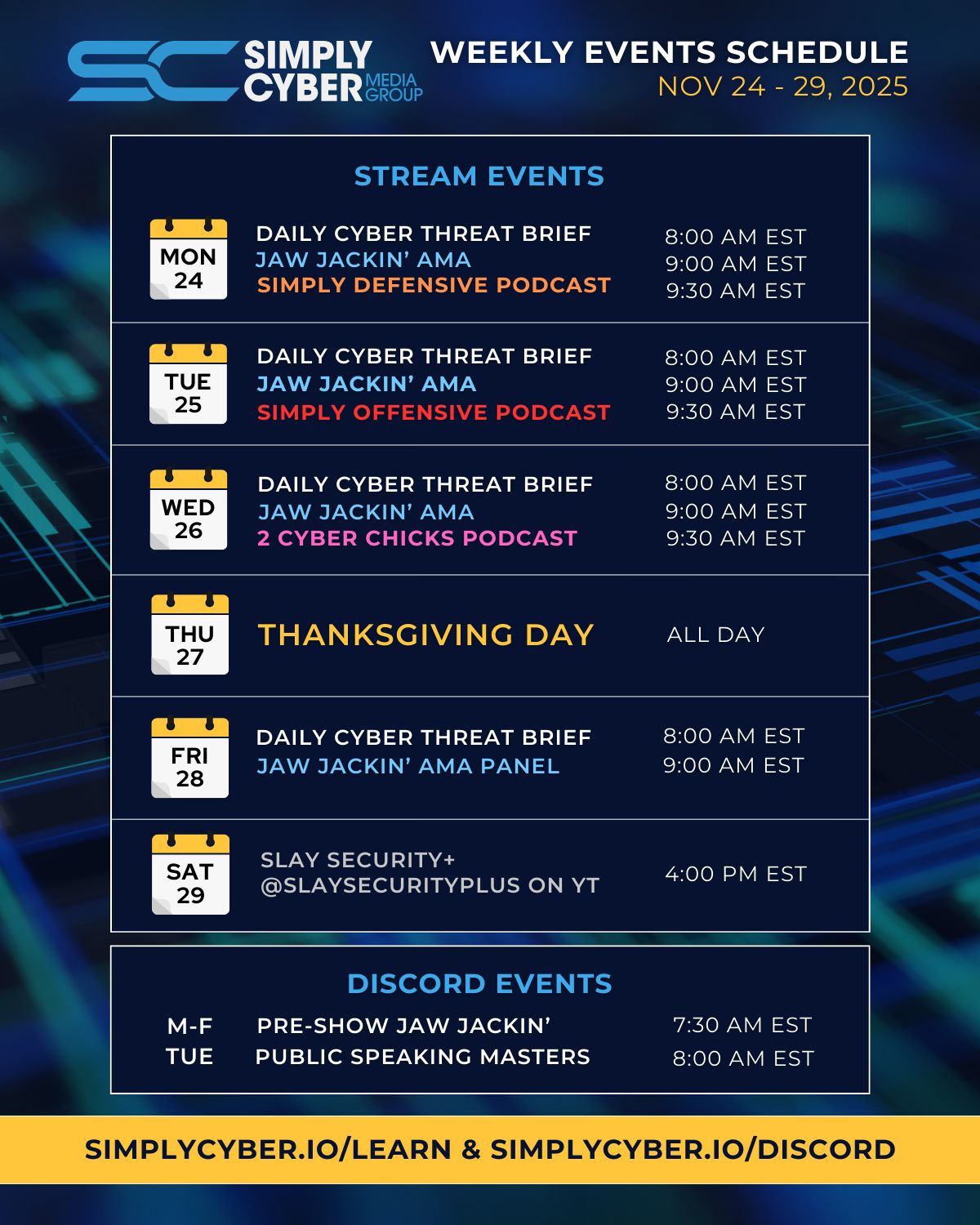 Find more about what’s happening this week in the Simply Cyber community, below. Join us on the Daily Cyber Threat Brief happening every weekday morning at 8 AM Eastern on YouTube and LinkedIn.