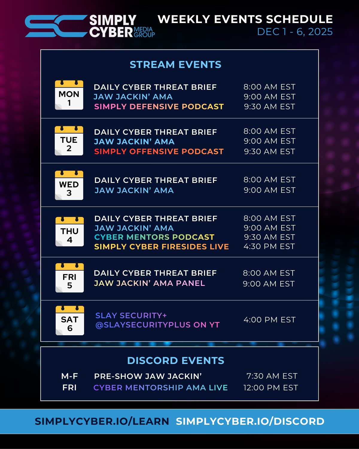 Find more about what’s happening this week in the Simply Cyber community, below. Join us on the Daily Cyber Threat Brief happening every weekday morning at 8 AM Eastern on YouTube and LinkedIn.