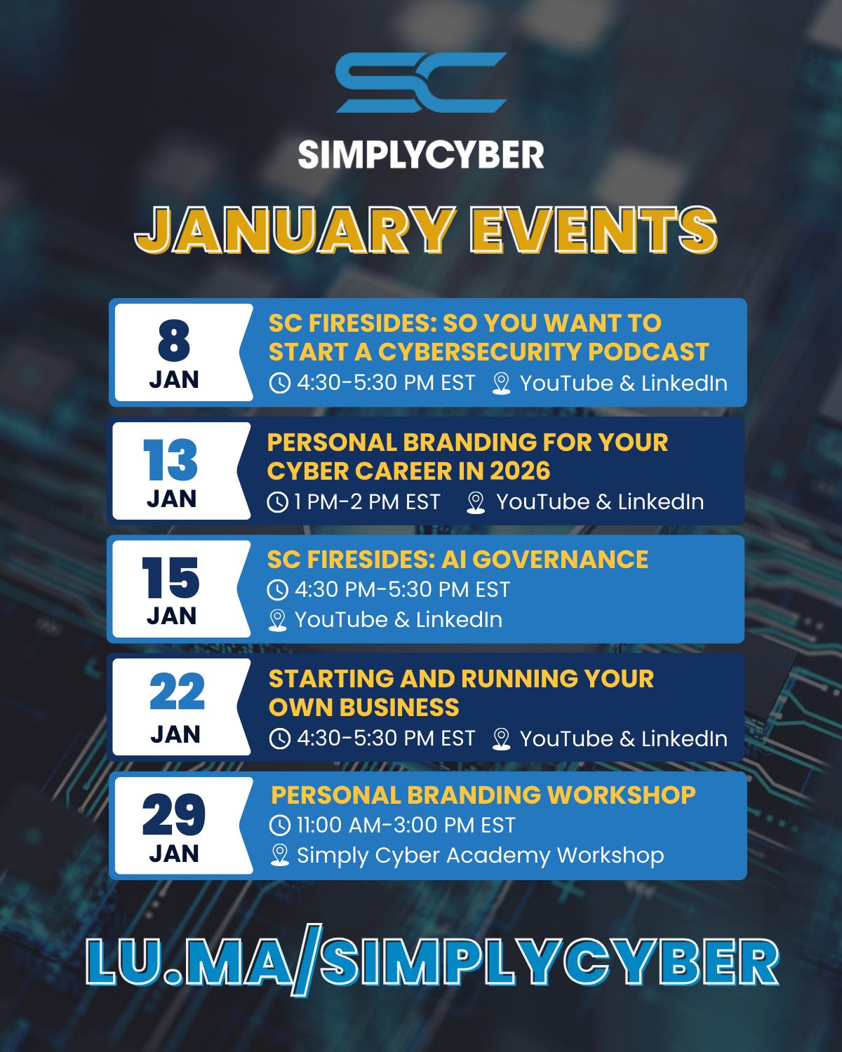 Want to know what’s happening at Simply Cyber at any given time? Head over to the SC Monthly Events Calendar to register for new and upcoming events for the month - don’t forget to subscribe! lu.ma/simplycyber