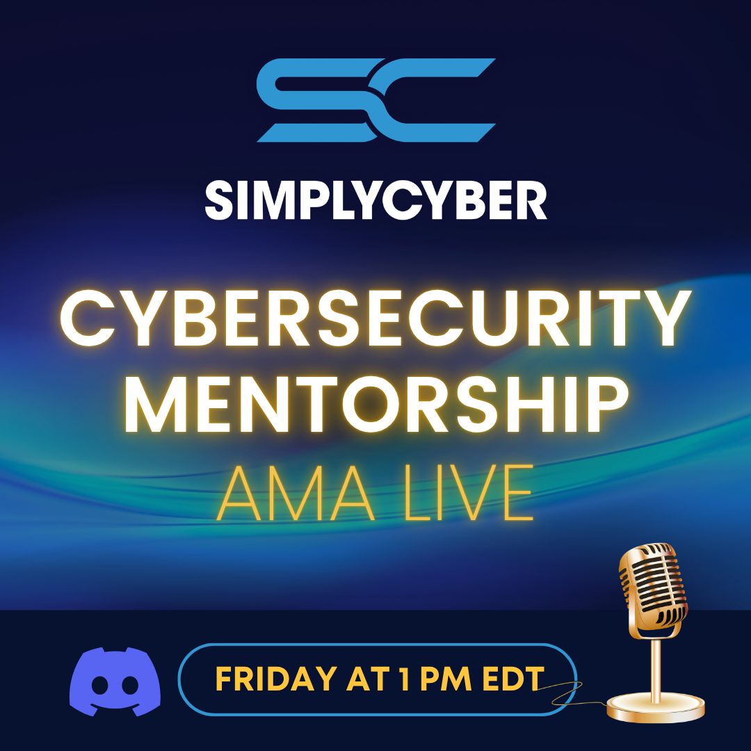 Join us for the Monthly Cybersecurity Mentorship AMA in Simply Cyber Discord, happening this Friday at 1 PM EDT.